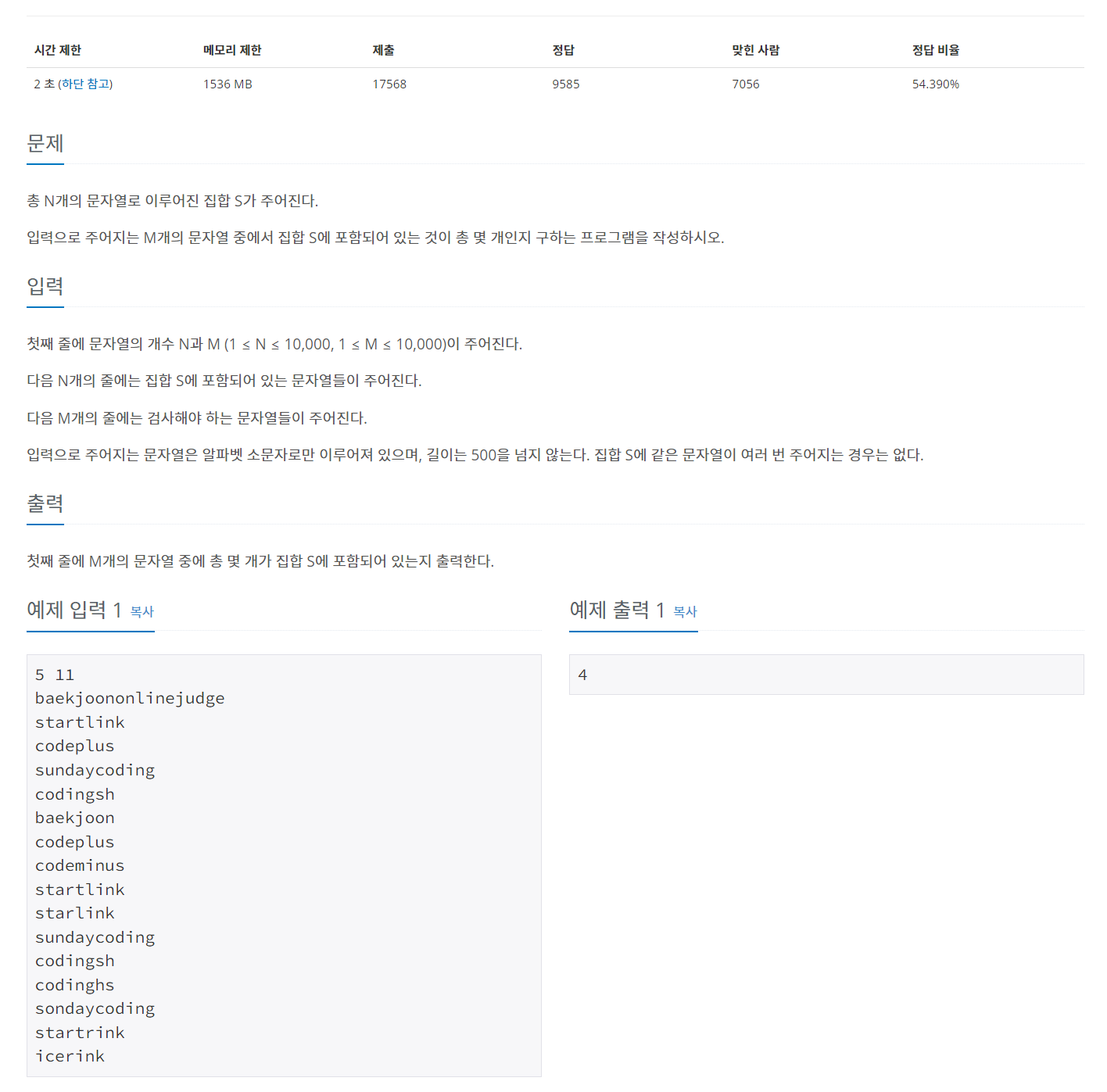 첫째 줄에 문자열의 개수 N과 M (1 ≤ N ≤ 10,000, 1 ≤ M ≤ 10,000)이 주어진다. 다음 N개의 줄에는 집합 S에 포함되어 있는 문자열들이 주어진다. 다음 M개의 줄에는 검사해야 하는 문자열들이 주어