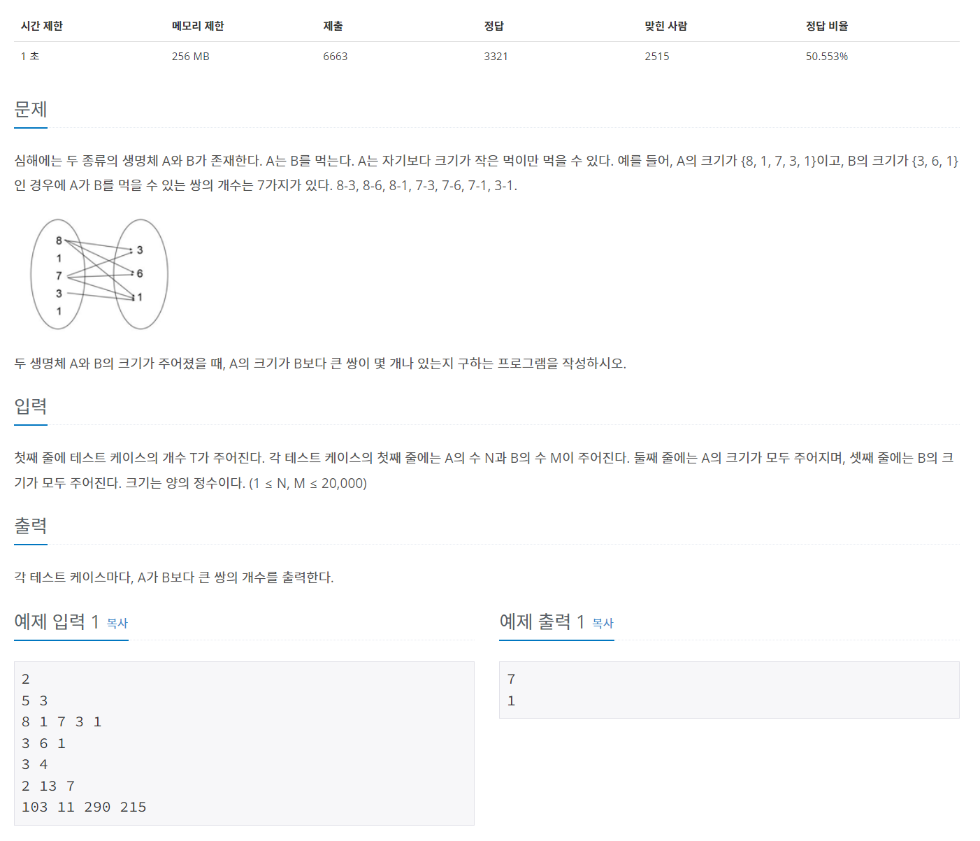 심해에는 두 종류의 생명체 A와 B가 존재한다. A는 B를 먹는다. A는 자기보다 크기가 작은 먹이만 먹을 수 있다. 예를 들어, A의 크기가 {8, 1, 7, 3, 1}이고, B의 크기가 {3, 6, 1}인 경우에 A가 B를 먹을