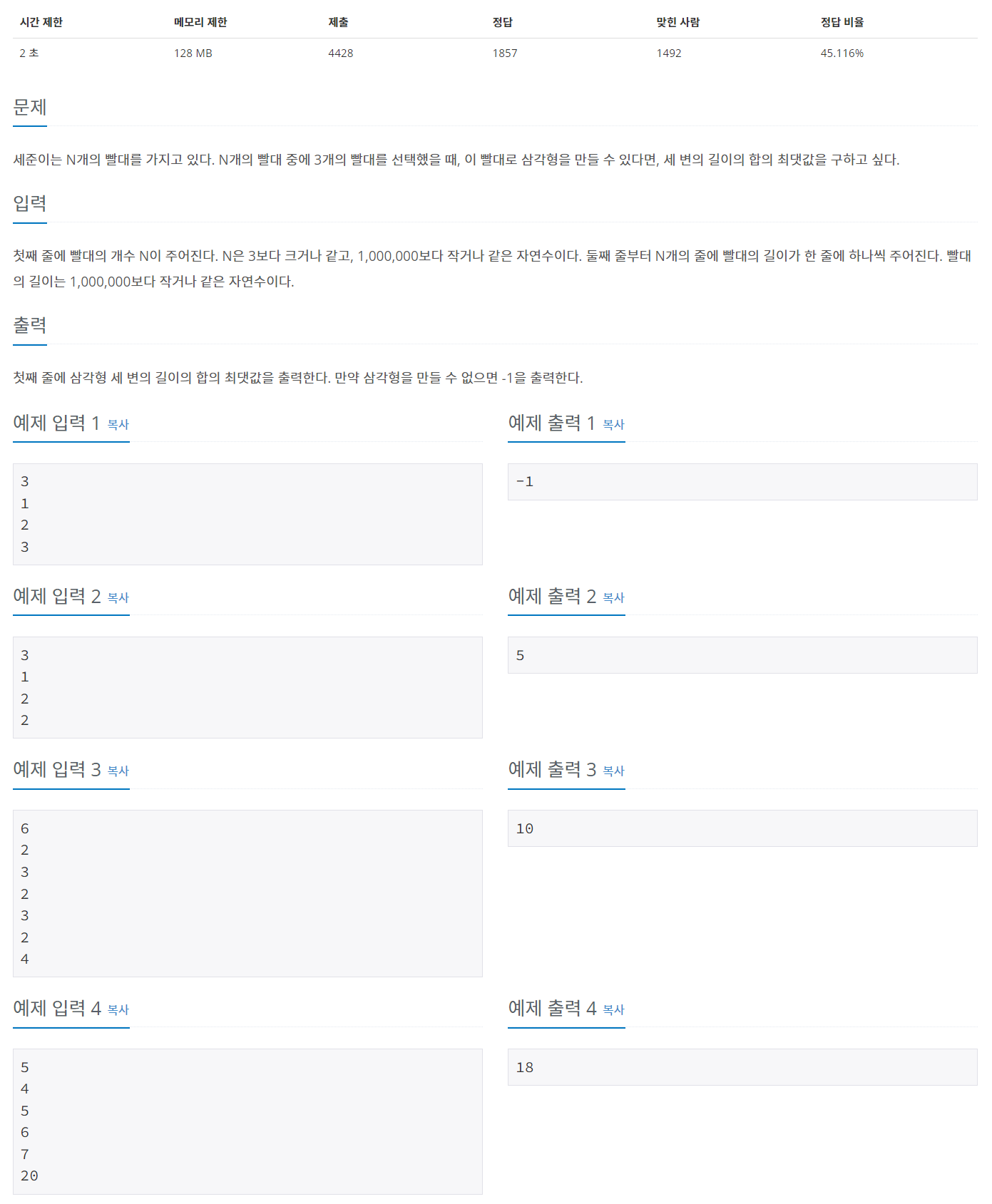 만들 수 있는 삼각형 중 세 변의 길이가 가장 크려면 입력 받은 빨대의 길이를 정렬하고 가장 긴 변의 길이를 정렬된 배열을 토대로 낮추면서 삼각형이 될 수 있는 세 변의 최댓값을 찾아주면 된다.