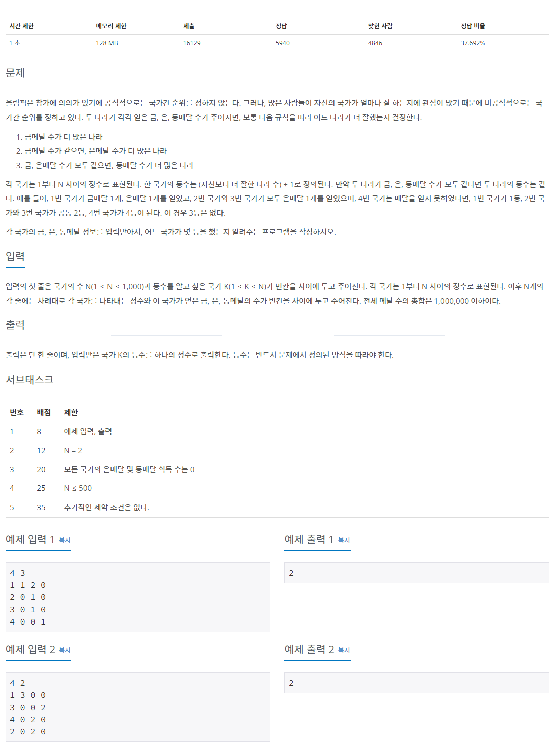 입력의 첫 줄은 국가의 수 N(1 ≤ N ≤ 1,000)과 등수를 알고 싶은 국가 K(1 ≤ K ≤ N)가 빈칸을 사이에 두고 주어진다. 각 국가는 1부터 N 사이의 정수로 표현된다. 이후 N개의 각 줄에는 차례대로 각