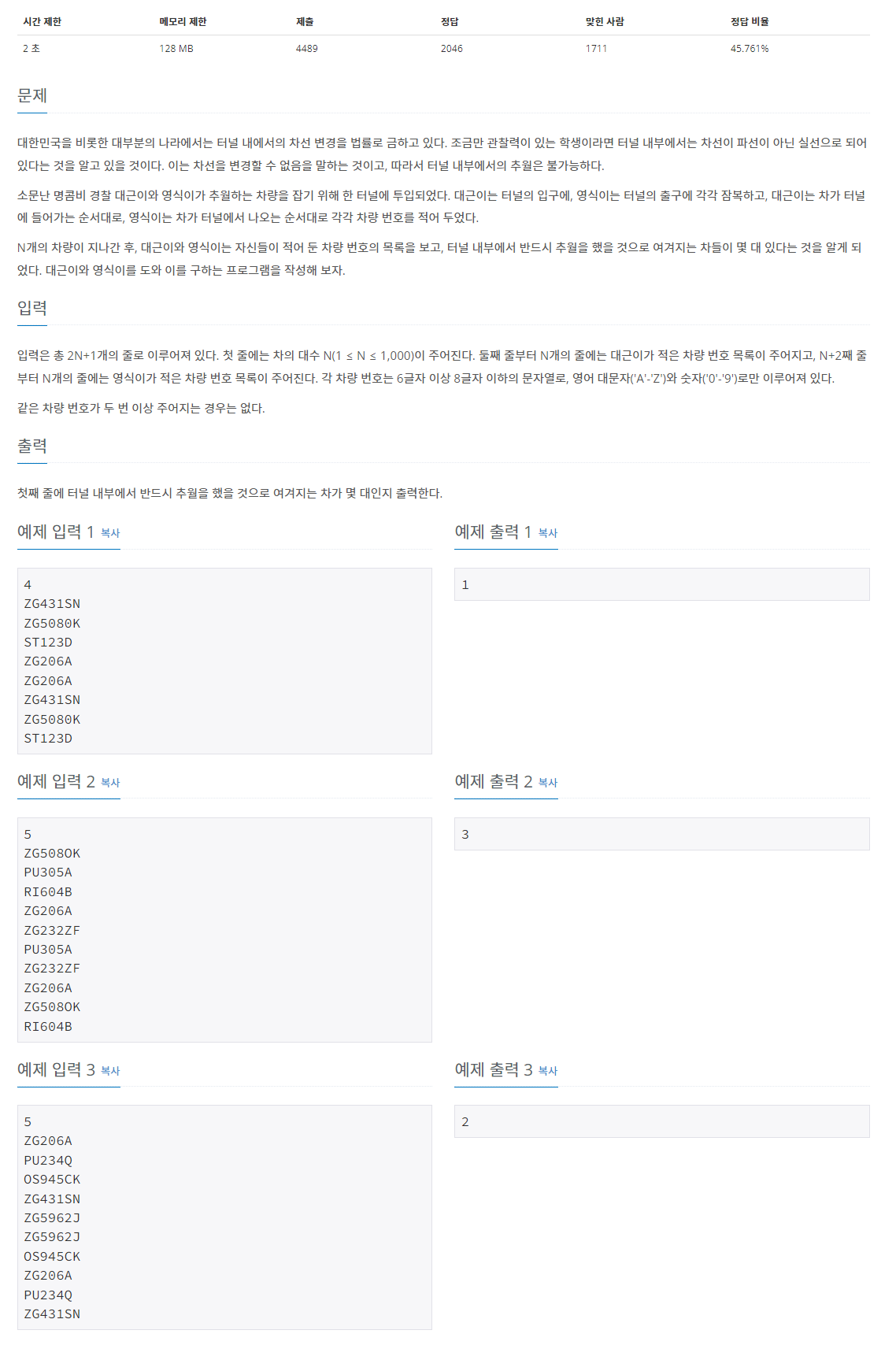 입력은 총 2N+1개의 줄로 이루어져 있다. 첫 줄에는 차의 대수 N(1 ≤ N ≤ 1,000)이 주어진다. 둘째 줄부터 N개의 줄에는 대근이가 적은 차량 번호 목록이 주어지고, N+2째 줄부터 N개의 줄에는 영식이