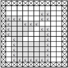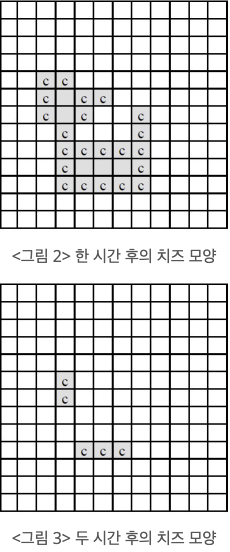 아래 <그림 1>과 같이 정사각형 칸들로 이루어진 사각형 모양의 판이 있고, 그 위에 얇은 치즈(회색으로 표시된 부분)가 놓여 있다. 판의 가장자리(<그림 1>에서 네모 칸에 X친 부분)에는 치즈가 놓