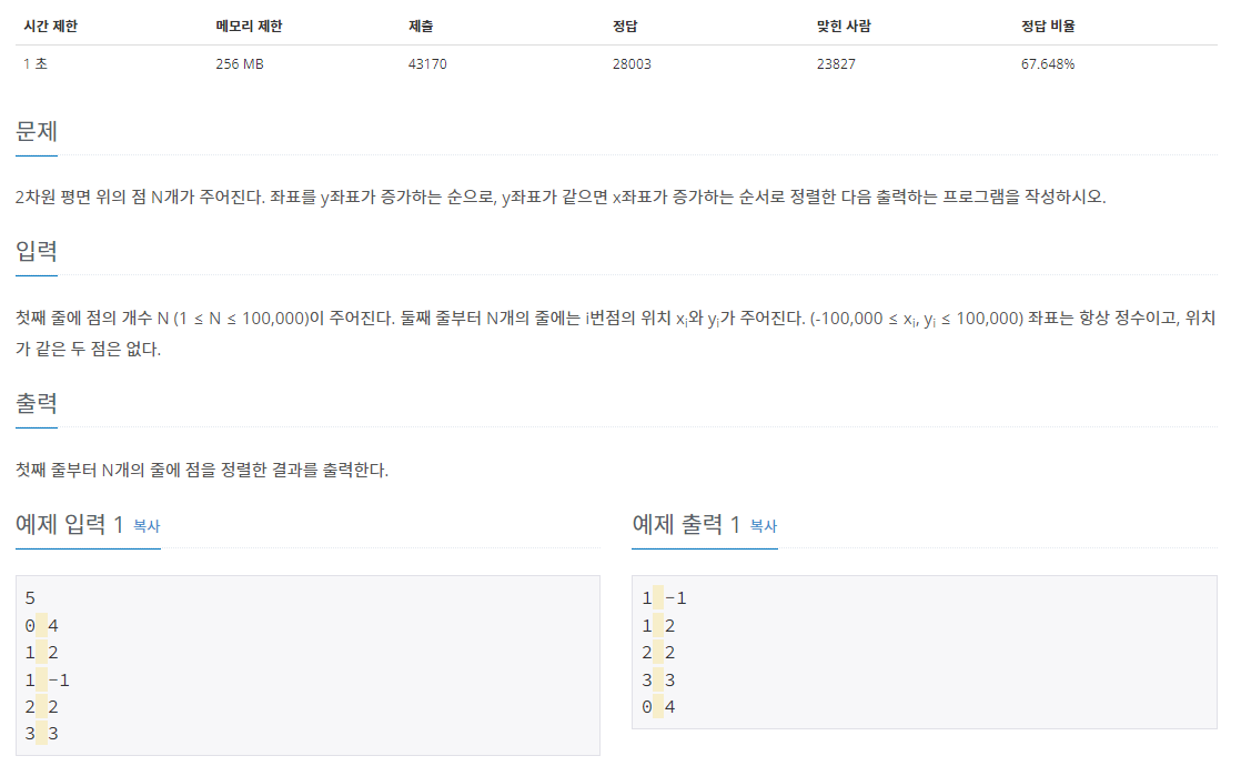 Arrays.sort()를 사용해 2차원 배열을 y좌표로 오름차순 정렬하고 y좌표가 같다면 x좌표로 오름차순 정렬하여 문제를 해결하였다.