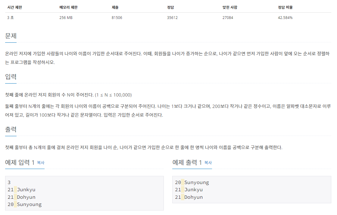 온라인 저지에 가입한 사람들의 나이와 이름이 가입한 순서대로 주어진다. 이때, 회원들을 나이가 증가하는 순으로, 나이가 같으면 먼저 가입한 사람이 앞에 오는 순서로 정렬하는 프로그램을