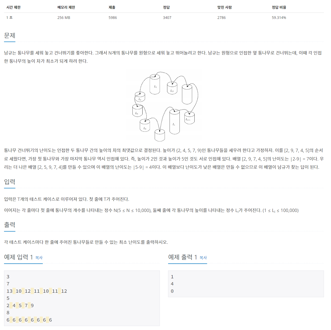 통나무 건너뛰기의 난이도는 인접한 두 통나무 간의 높이의 차의 최댓값인데 이 최댓값을 최소로 만드는 것이 이 문제의 핵심이다.