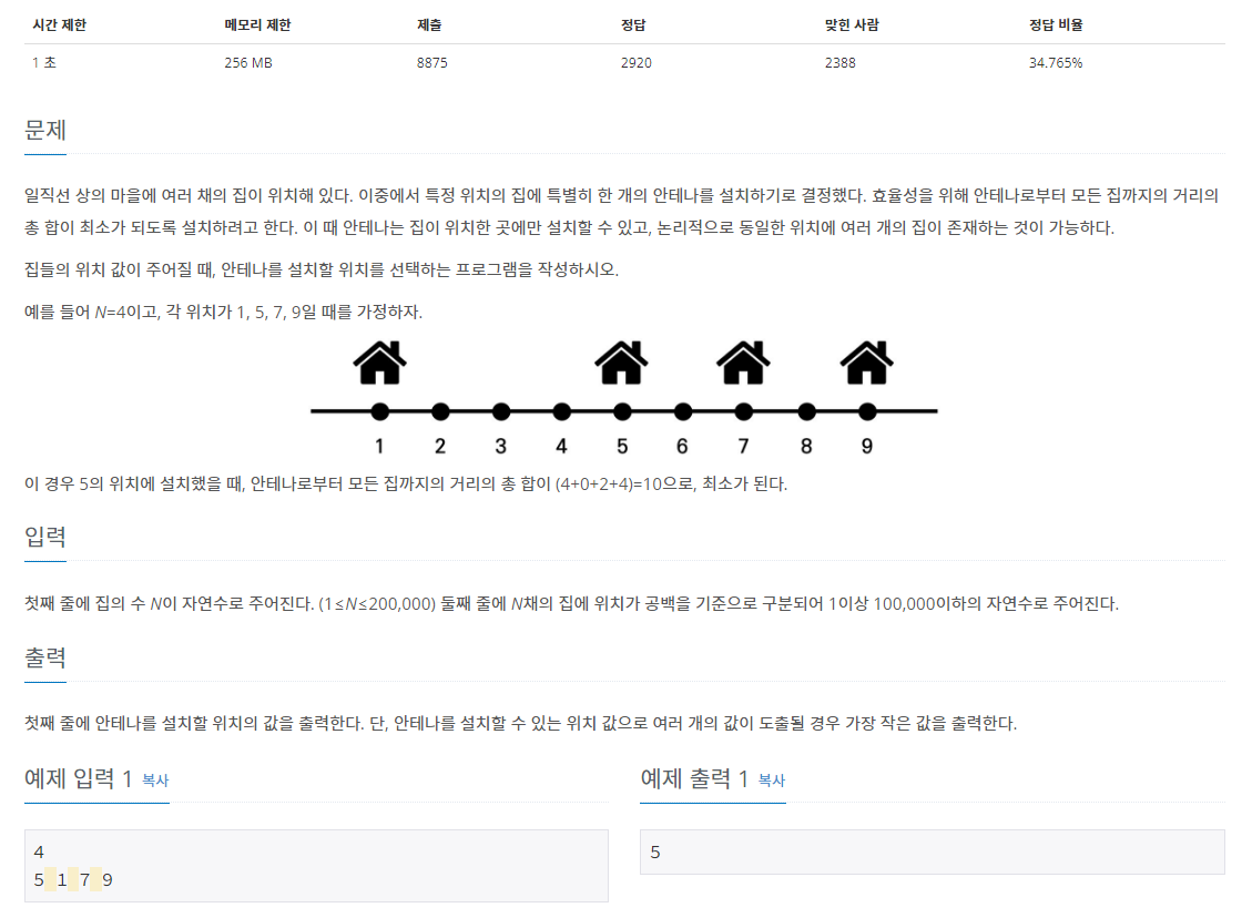 집의 위치가 주어졌을 때 안테나로부터 모든 집까지의 거리의 총 합이 최소가 되려면 집 위치의 중간에 안테나를 설치하면 된다. 어찌 보면 당연한 것이긴 하다. 고로 집들의 위치를 정렬해서 중간인 집 위치를 출력해주면 되는데 집의 개수가 짝수개인 경우는 정확히 집의 중간이 없으므로 중간 위치에 있는 집 2개 중 더 작은 위치를 가진 집을 출력해주면 문제는 해결된다. 왜냐하면 중간 위치에 있는 집 2개는 안테나 설치 시 총 합의 값이 같기 때문이다.