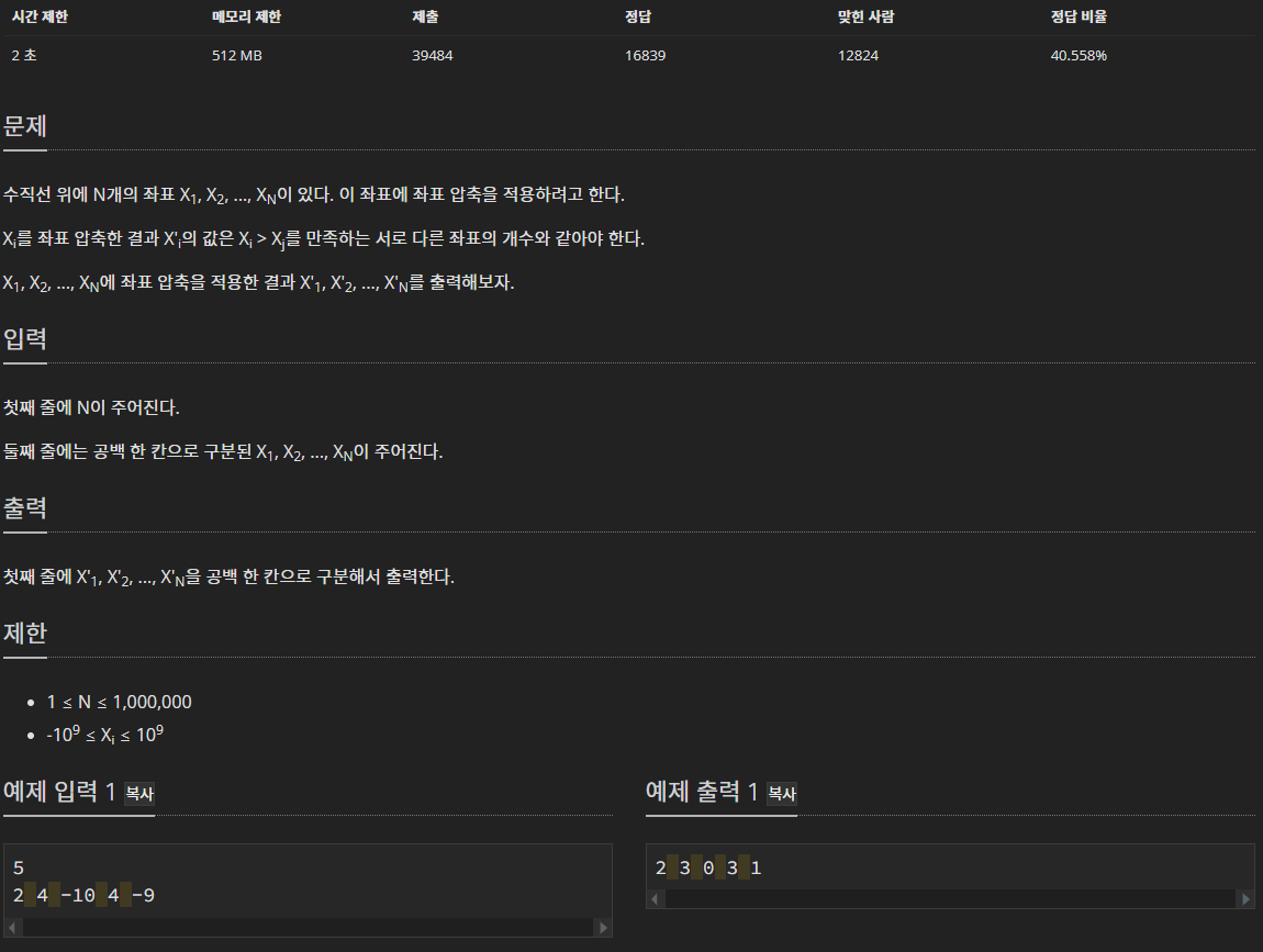 수직선 위에 N개의 좌표 X1, X2, ..., XN이 있다. 이 좌표에 좌표 압축을 적용하려고 한다. Xi를 좌표 압축한 결과 X'i의 값은 Xi > Xj를 만족하는 서로 다른 좌표의 개수와 같아야 한다. X1, X2, ..., XN에 좌