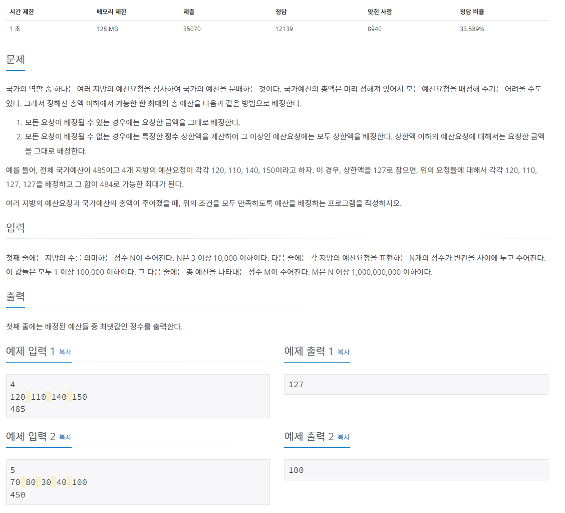 가능한 총 예산액을 기준으로 이진 탐색을 수행하여 문제를 해결하였다.